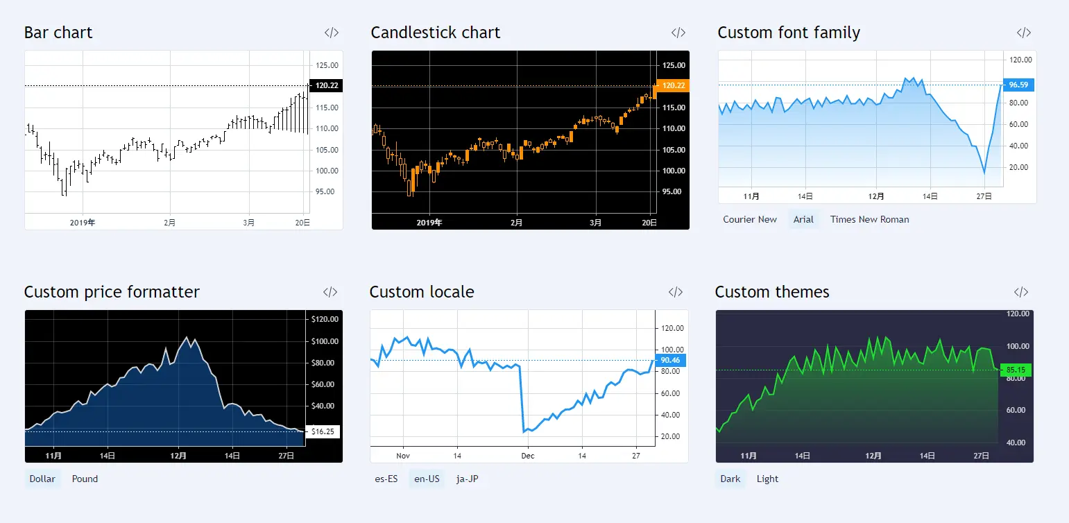 カスタマイズやデータの渡し方は、Lightweight Chartsのサイトに載っている例を参考にするといいでしょう