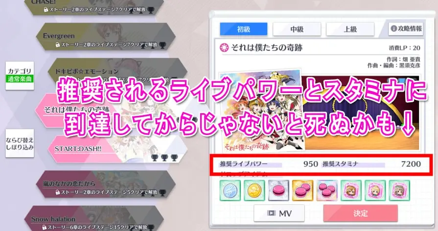 ライブをプレイする前に表示されている「推奨スタミナ」を確認してそれに到達するようにユニット編成したりキャラ育成する必要があります