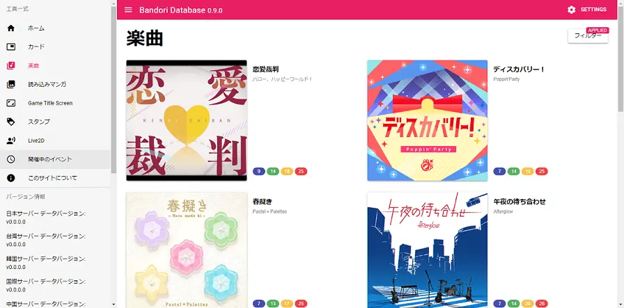 上記リンクからBandori Databaseのサイトにアクセスします。