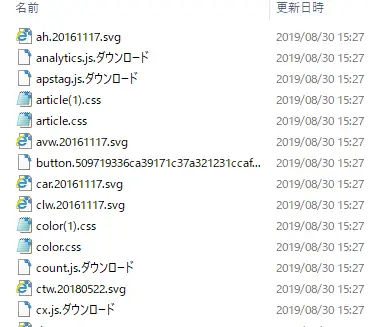 Chromeでページをダウンロードするとこんなかんじでjsファイルのファイル名に「.ダウンロード」という文字列がついてしまう。