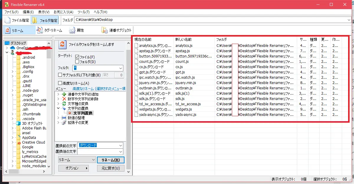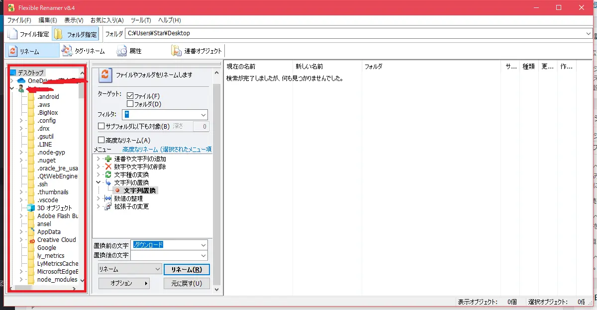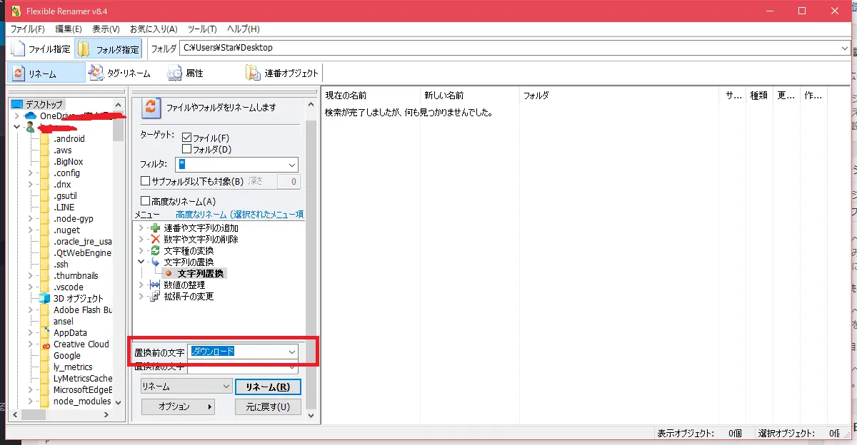 フォルダを選んだら次は赤枠で囲ったところに置換したい文字を入力する。今回は「.ダウンロード」となる。(その上のメニューで「文字列の置換」が選択されていたかったら選択しておこう)