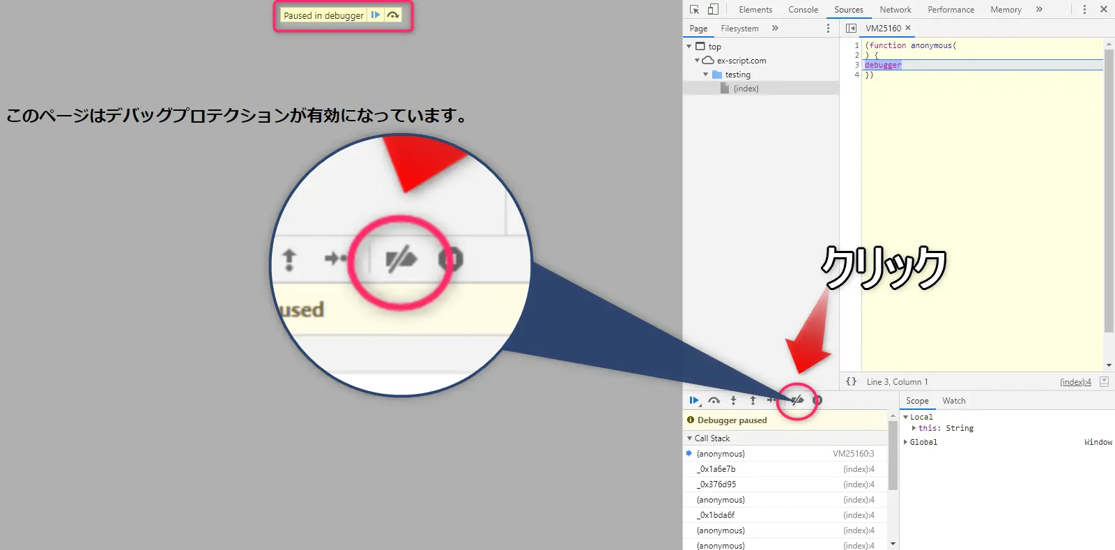 開発者ツールを開くとデバッグプロテクションが発動すると思いますので、ブロックされたら開発者ツールで解除する操作をします。