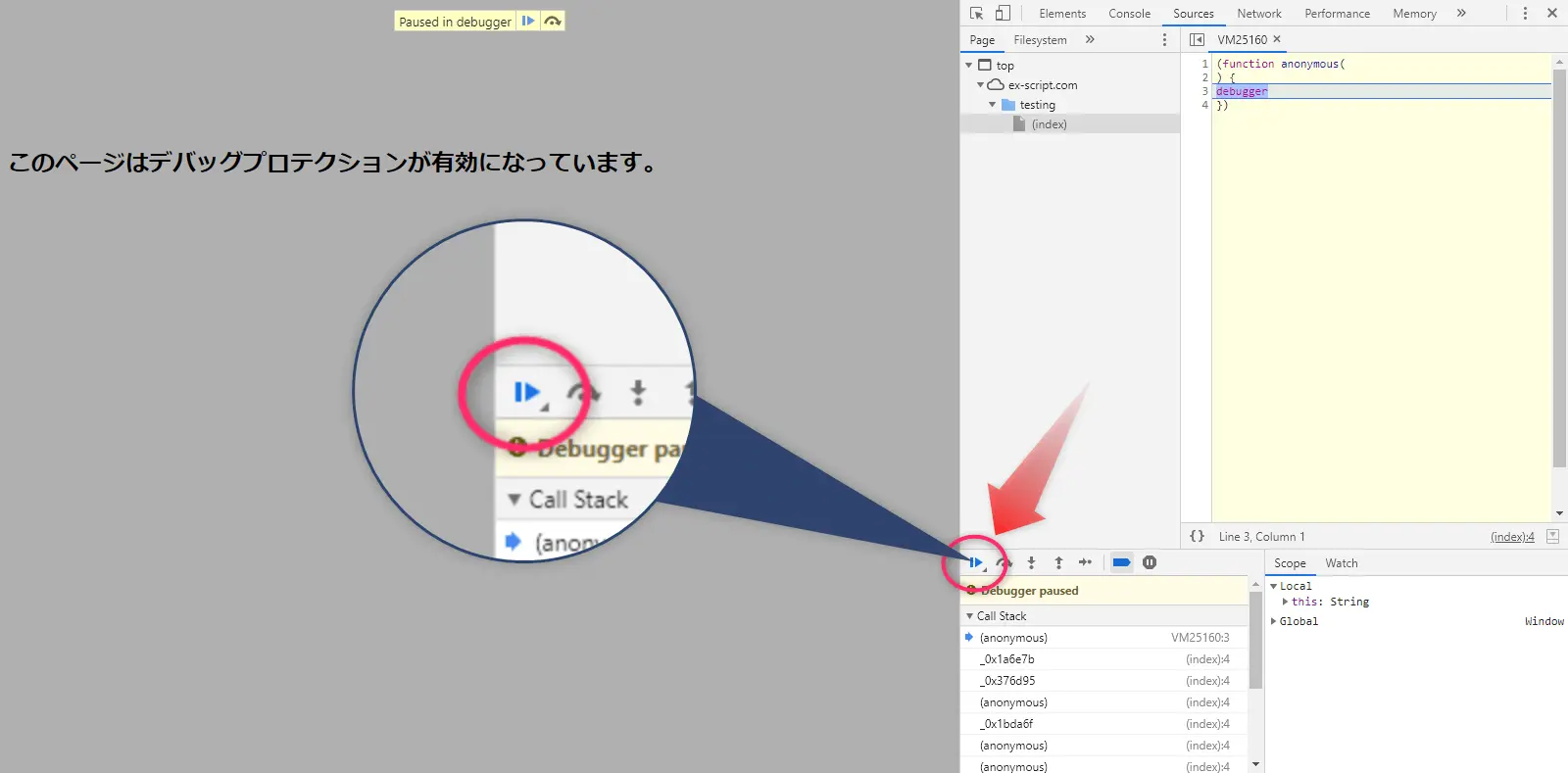 これはデバッグプロテクションが動作しているときに表示されるものです。つまり、第三者が開発者ツールなどを使ってデバッグするのを防止するためにサイトを作った人がデバッグプロテクションを仕込んでいるということです。