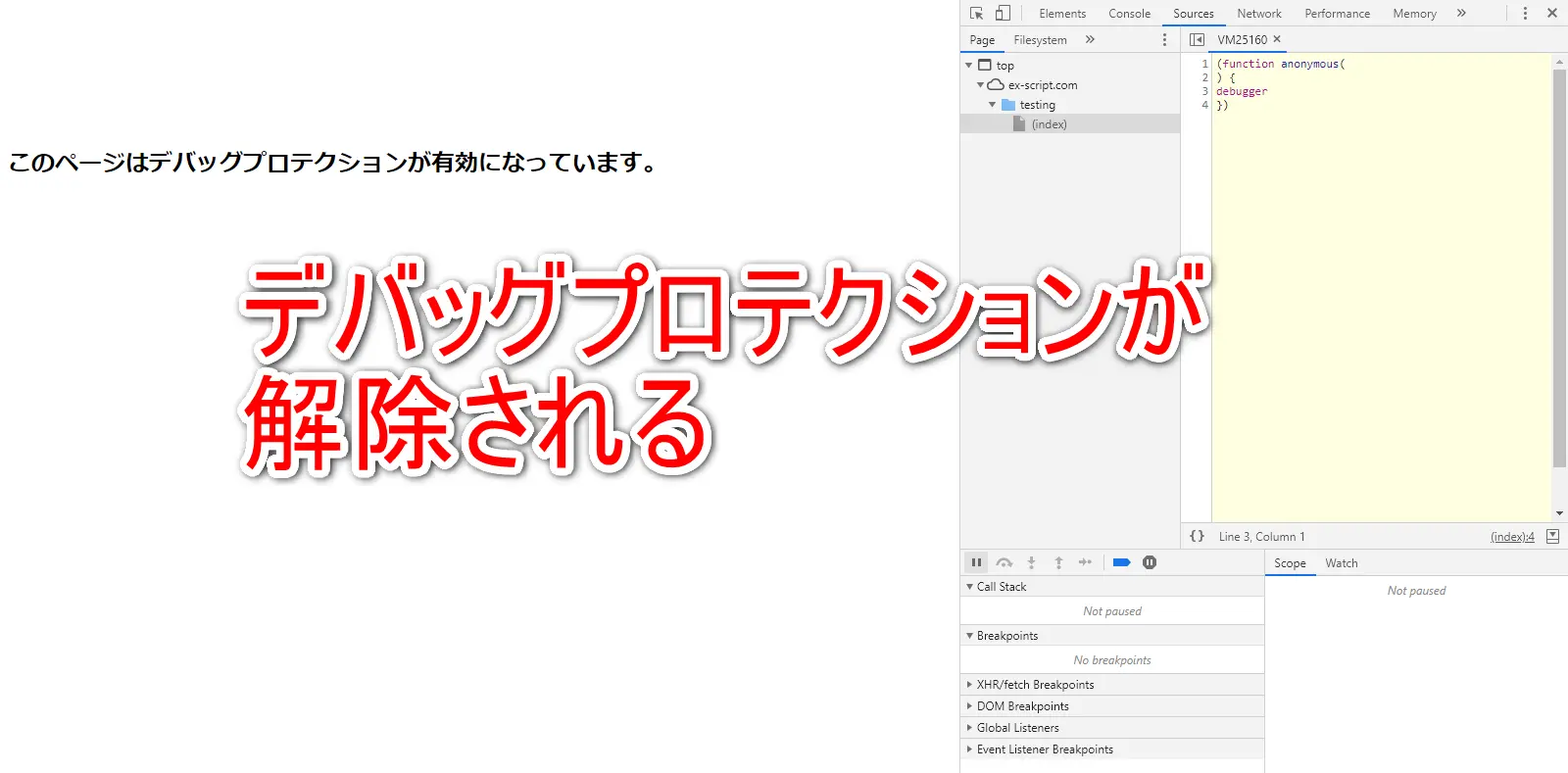 デバッグプロテクションの他にコードの難読化やconsole.log書き換えなどをしているサイトもあるので、その場合は厄介ですがデバッグプロテクションしか仕込んでないサイトは難なくデバッグできます。