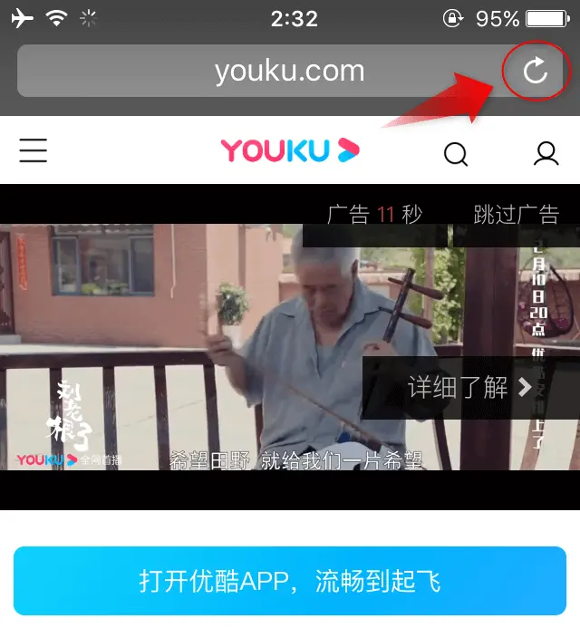 すると広告が再生されますが、即座にリロードボタンをタップします!