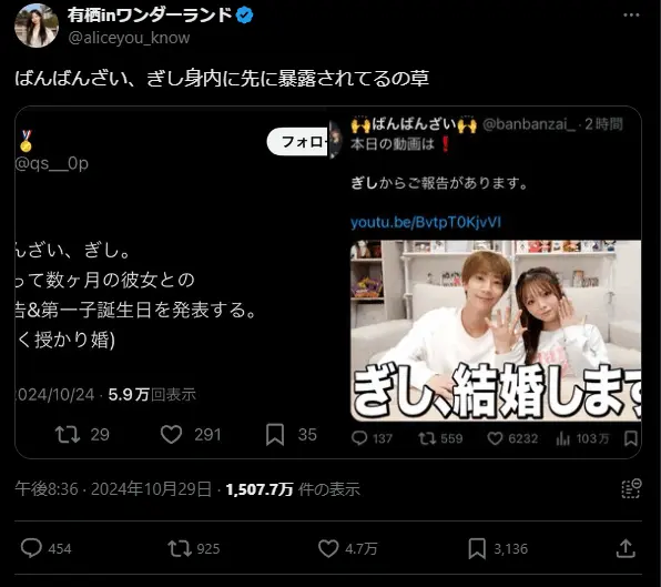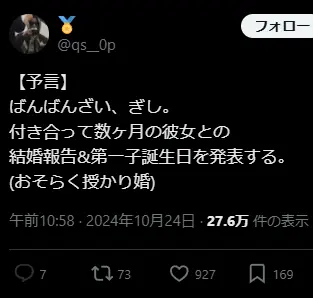 結婚発表の数日前、あるTwitterユーザーが「【予言】ばんばんざい、ぎし。付き合って数ヶ月の彼女との結婚報告&第一子誕生日を発表する。(おそらく授かり婚)」と投稿。このツイートは瞬く間に拡散され、27.6万回以上表示される事態となった。