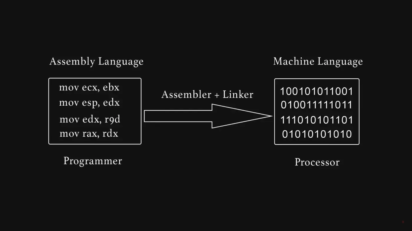 プログラムは、C++、Java、Python などの言語で書かれています。これらの言語は人間にとっては非常にわかりやすいのですが、コンピュータにとっては全く意味不明なものです。このコミュニケーションのギャップを埋めるために、コードはマシンコードと呼ばれる、コンピュータが理解できる 0 と 1 の羅列に変換されます。この変換プロセスをコンパイルと呼びます。